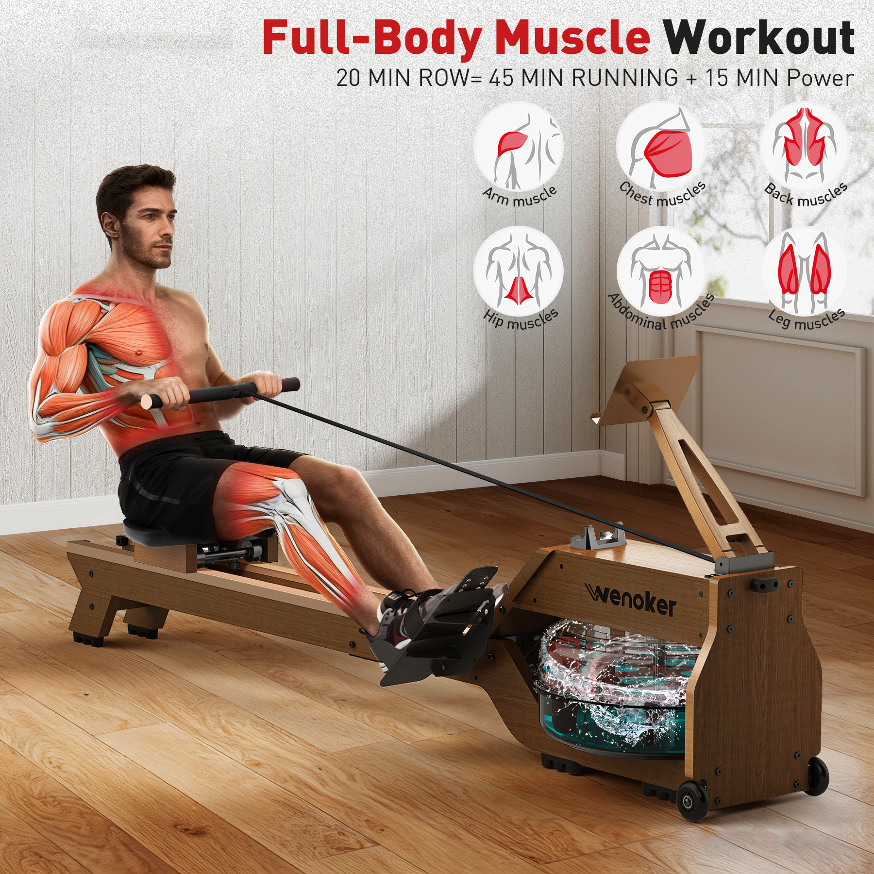 Rowing activates shoulders, back, arms, core, glutes, hamstrings, and legs. The powerful water resistance also improves cardiovascular endurance, delivering a complete full-body workout in as little as 30 minutes.