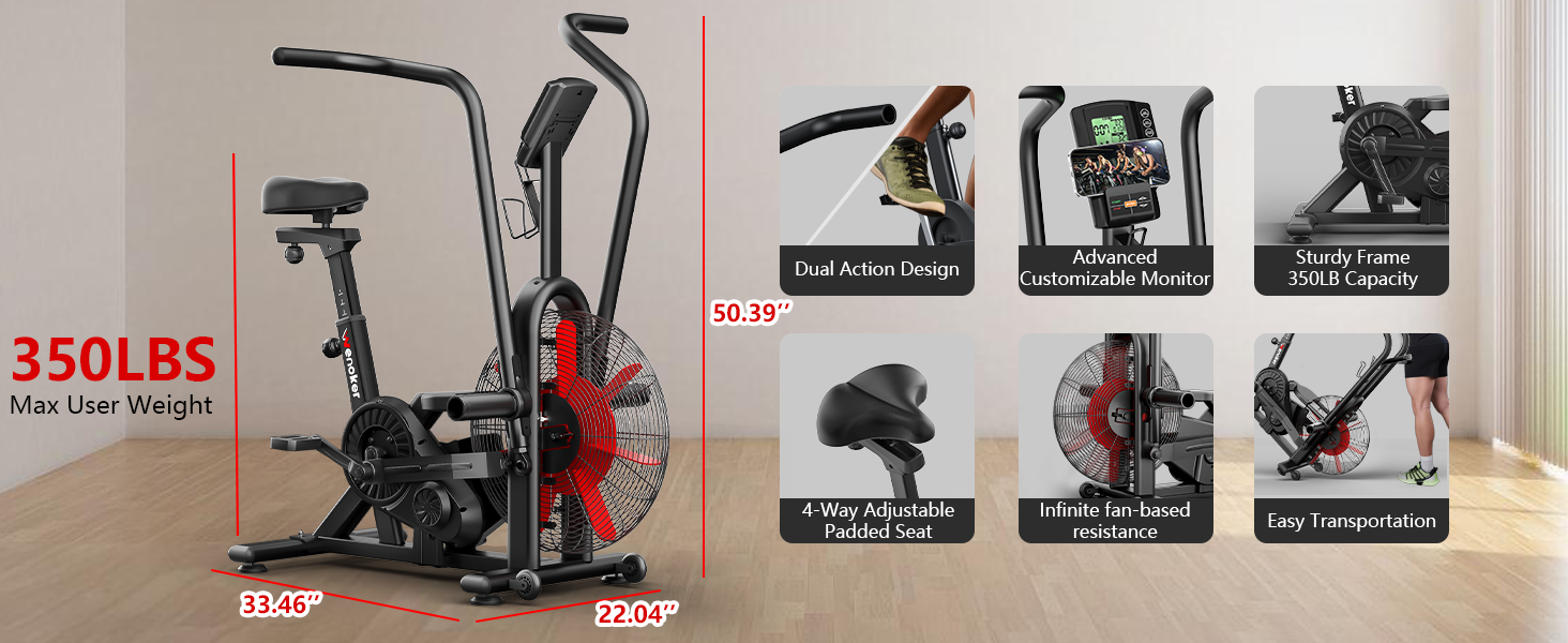 - 【ALL-IN-ONE TRAINING POWERHOUSE】 This high-performance air bike features a heavy-duty steel frame that ensures exceptional strength and durability. The innovative fan design delivers limitless, responsive resistance tailored for high-energy workouts.